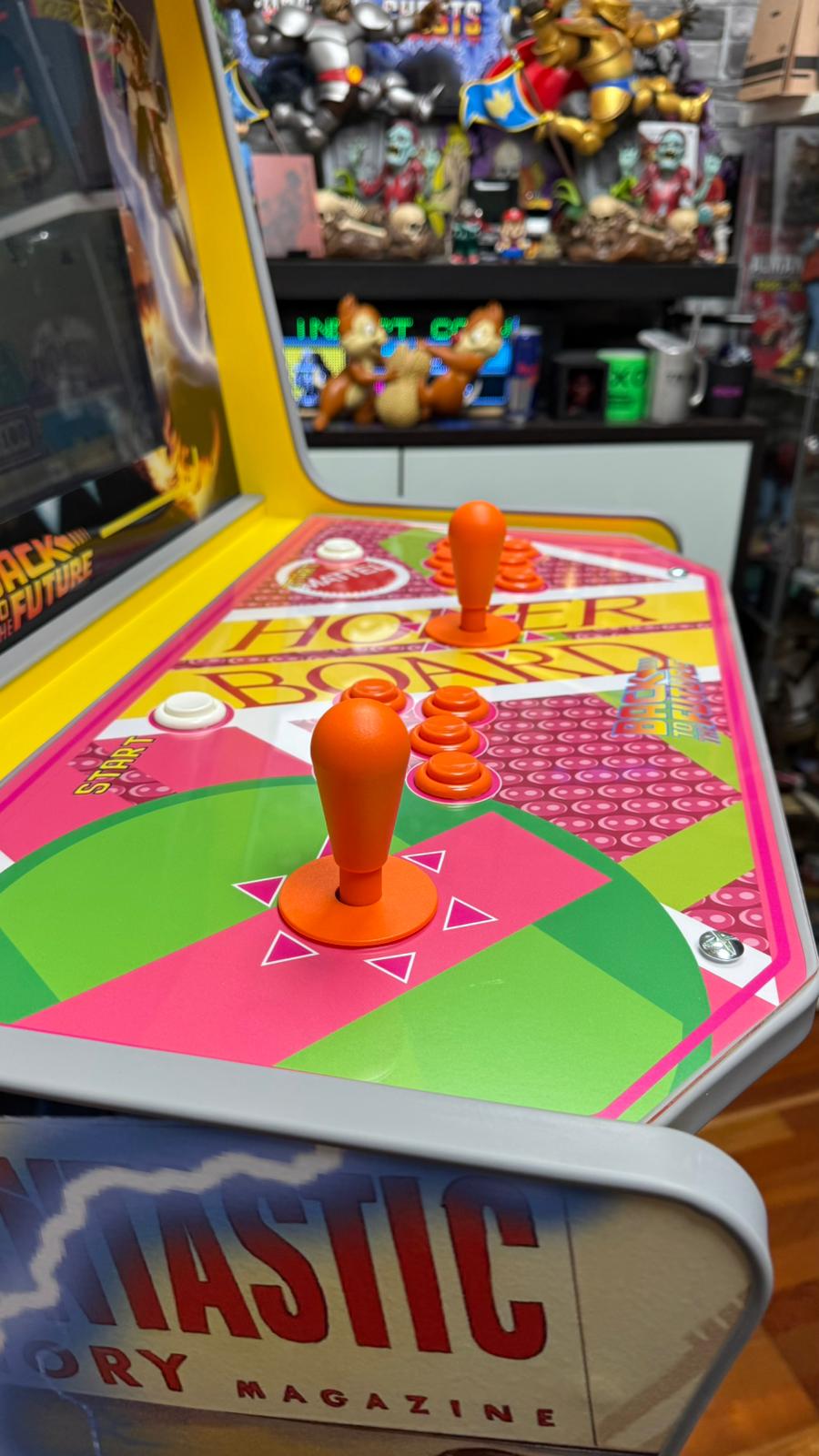 El proceso de fabricación no fue simple, fue una labor de arqueología cinematográfica, buscando las mejores combinaciones artísticas posibles para nuestro “experimento científico”. Cada rincón de la máquina responde a un elemento icónico de la saga. Por un lado, tenemos en su lateral las ilustraciones de la propaganda “Save The Clock Tower”, rindiendo homenaje al clímax de la película, con el rayo golpeando la torre del reloj y un Marty McFly que parece saltar fuera del mueble.
