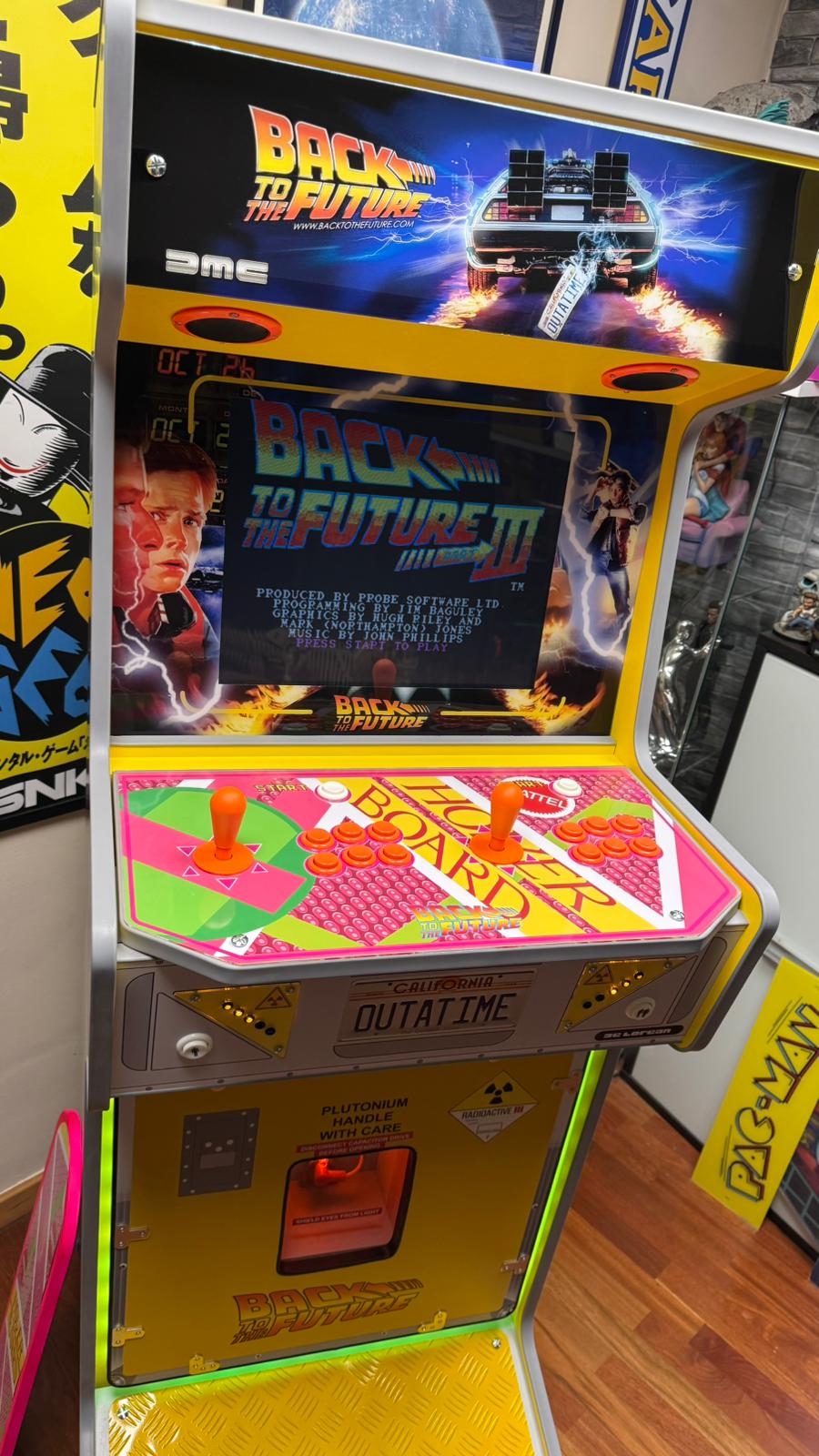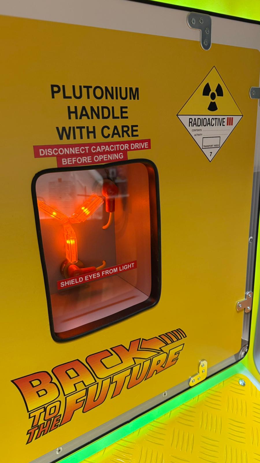Sin embargo, la parte más especial y técnica de la máquina se encuentra en su base. Cris Arcades se inspiró profundamente en el baúl de transporte de plutonio que Doc Brown "toma prestado" de los libios al principio de la película. En la película, este baúl es de un amarillo industrial chillón, diseñado para advertir del peligro radiactivo. Cris Arcades replicó esa sensación de "equipo científico de alto riesgo" en la puerta inferior de la arcade. Incluyendo etiquetas de advertencia de "Radioactive III" y el mensaje "Plutonium Handle With Care".
